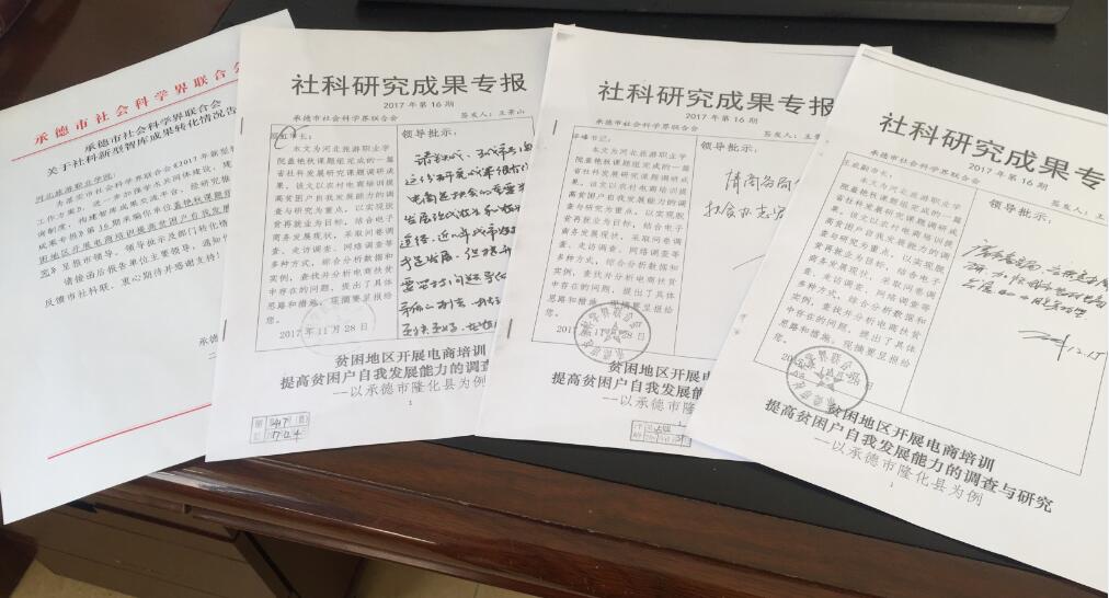 2017年12月4日,我院盖艳秋副教授课题组撰写的研究报告《贫困地区开展电商培训提高贫困户自我发展能力的调查与研究》(刊登在承德市社科联《社科研究成果专报》2017年第16期),获市长常丽虹、市委副书记张泽锋、副市长王成等市领导重要批示,常市长在批示中提出,农村电商是扶贫的重要举措,也是发展现代农业和农村服务业的重要途径,肯定了研究成果的实用价值。张泽锋副书记、王成副市长也对报告充分肯定,并要求有关部门采纳相关建议。该建议是盖艳秋副教授主持完成的省社科发展研究课题的调研成果。