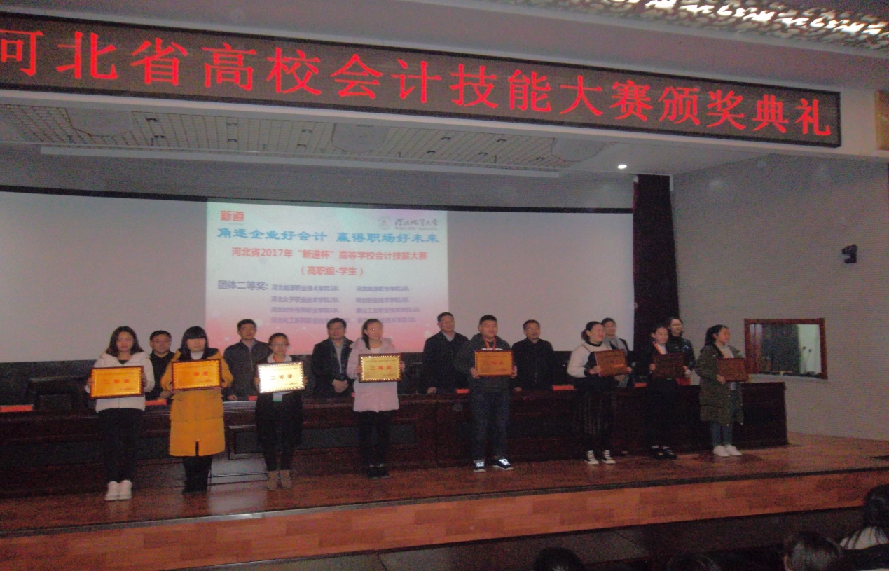 12月2日,由河北省教育厅主办、河北地质大学承办、新道科技股份有限公司协办的河北省2017年“新道杯”高等学校会计技能大赛圆满落幕。来自全省30多只代表队参加了激烈角逐,我院会计系代表队获得了团体二等奖的好成绩。周梓、徐明芳、李琳、黄林四名同学均获得个人二等奖。聂旺、胡红菊两位老师获得优秀指导教师。