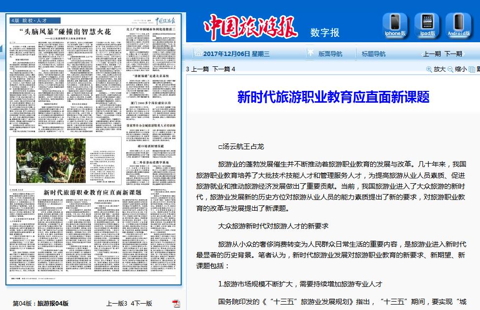 《中国旅游报》2017年12月6日以《新时代旅游职业教育应直面新课题》为题刊发汤云航院长在第26届全国旅游职业院校校长协作会上的主题发言。文章从需求数量、专业能力、综合素质和国际化水平四个方面深入分析了大众旅游新时代对旅游人才培养提出的新要求,并结合旅游职业教育实践,有针对性地提出了调整专业布局、坚持产教融合、推动国际交流与合作、推进创新创业教育、积极参与行业培训等五个方面的建议。文章立足产业发展大势,深入探讨了旅游职业教育未来发展的方向与策略,不仅有力地宣传了我院旅游专业教育教学的先进理念,还为全国旅游职业人才培养提供了可供参考的有益借鉴。