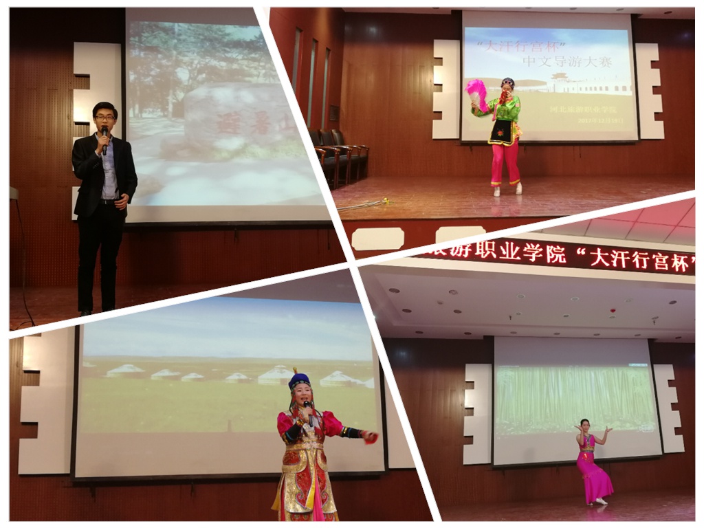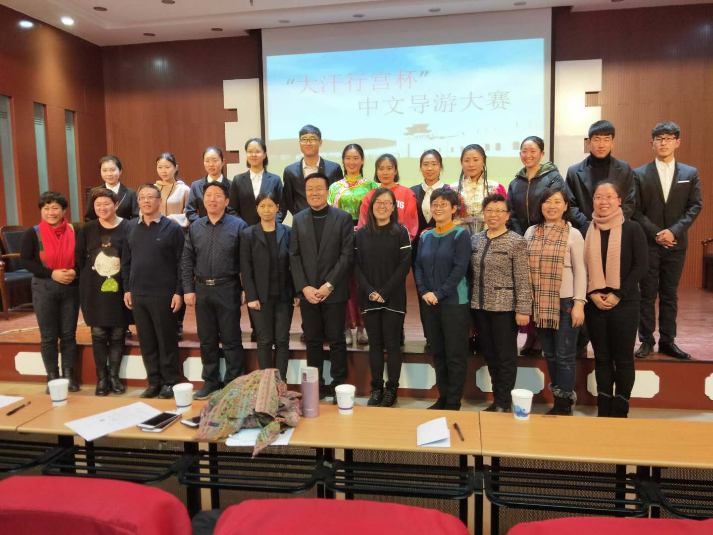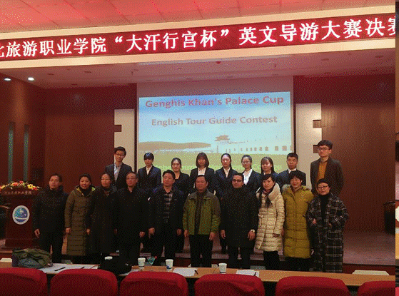 决赛聘请承德市旅游协会旅行社分会会长王国华先生,承德市旅游协会导游分会秘书长、全国优秀导游员舒建华女士,丰宁大汗行宫副总经理郭丹丹女士,学院李鸿教授,潘桂云教授,李军教授,李佳老师、张卫红老师、王秀芳老师、留学生太克等担任评委。