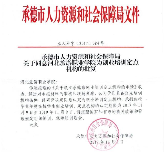 近日,承德市人力资源和社会保障局下发《关于同意河北旅游职业学院为创业培训定点机构的批复》(承人社字〔2017〕384号),学院被认定为创业培训定点机构。