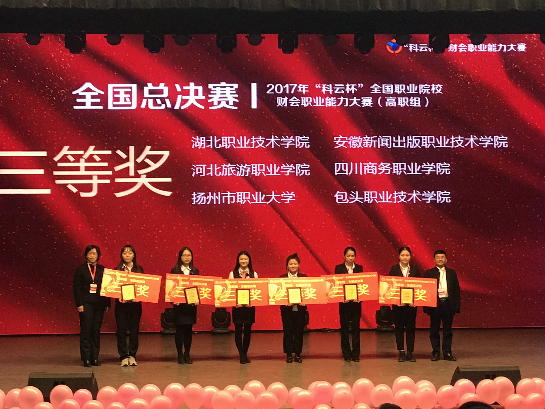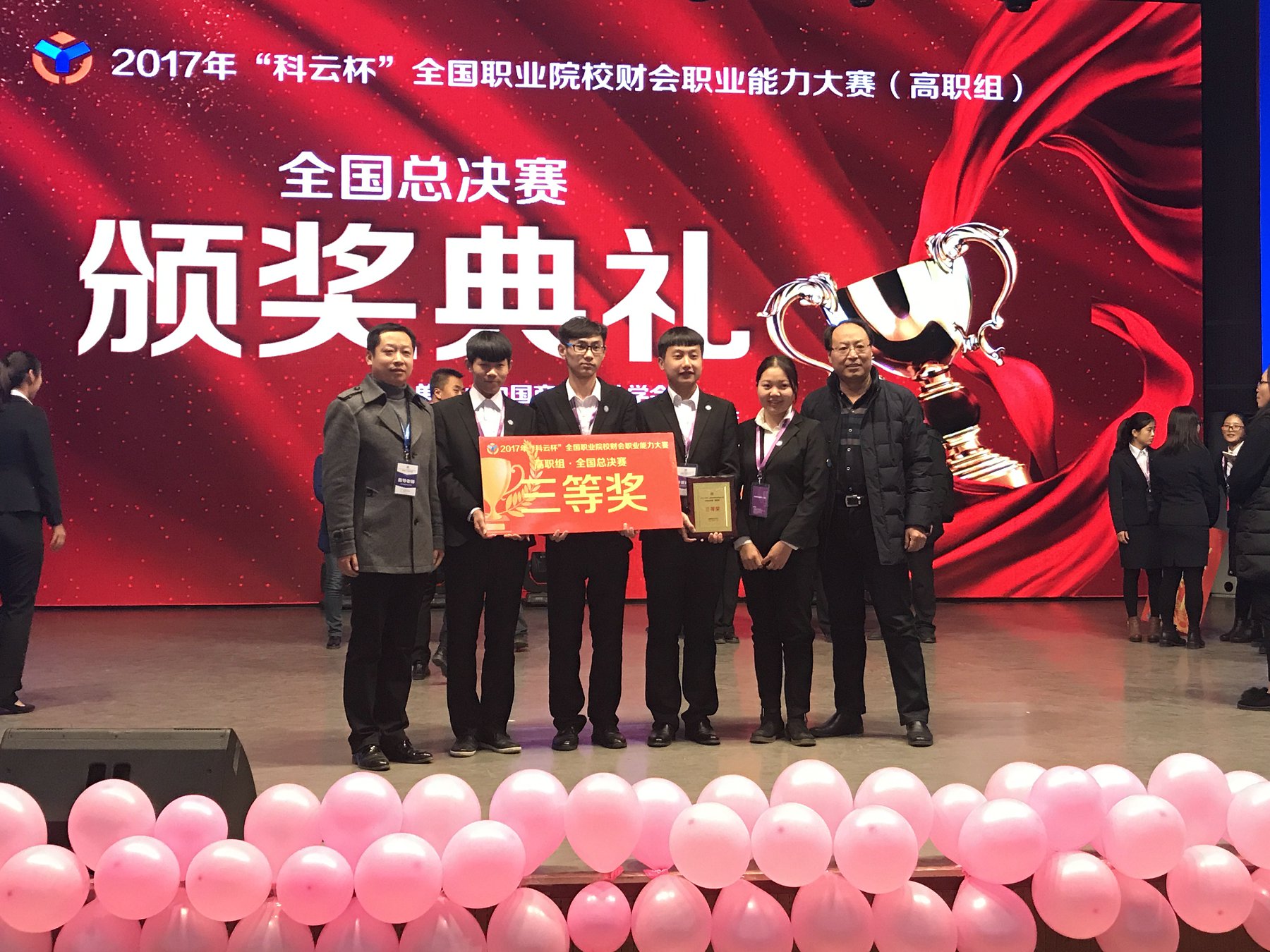 11月26日,由中国商业会计学会主办,山西省财政税务专科学校、厦门科云信息科技有限公司承办的2017年“科云杯”全国职业院校财会职业能力大赛全国总决赛在山西太原山西省财政税务专科学校圆满落幕。共有来自全国31个省市的近300所院校5万余学生参与大赛,经过激烈的角逐,共有36支代表队参加全国总决赛。我院会计系代表队最终获得了团体三等奖,王雅辉、卢帅、辛鹏、商帅军等4名同学均获得三等奖,聂旺、胡红菊获老师获优秀指导教师。(会计系供稿)