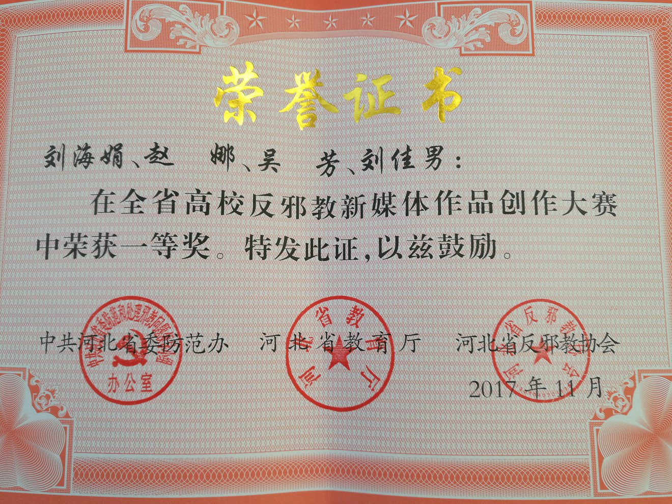 近日,在中共河北省委防范办、河北省教育厅和河北省反邪教协会联合举办的“2017年全省高校反邪教新媒体作品创作大赛”上,我院设计系刘海娟同学的作品《红灯停 绿灯行 邪禁行 正通行》荣获大赛一等奖,苑嘉诚、张金成等同学作品荣获优秀奖。