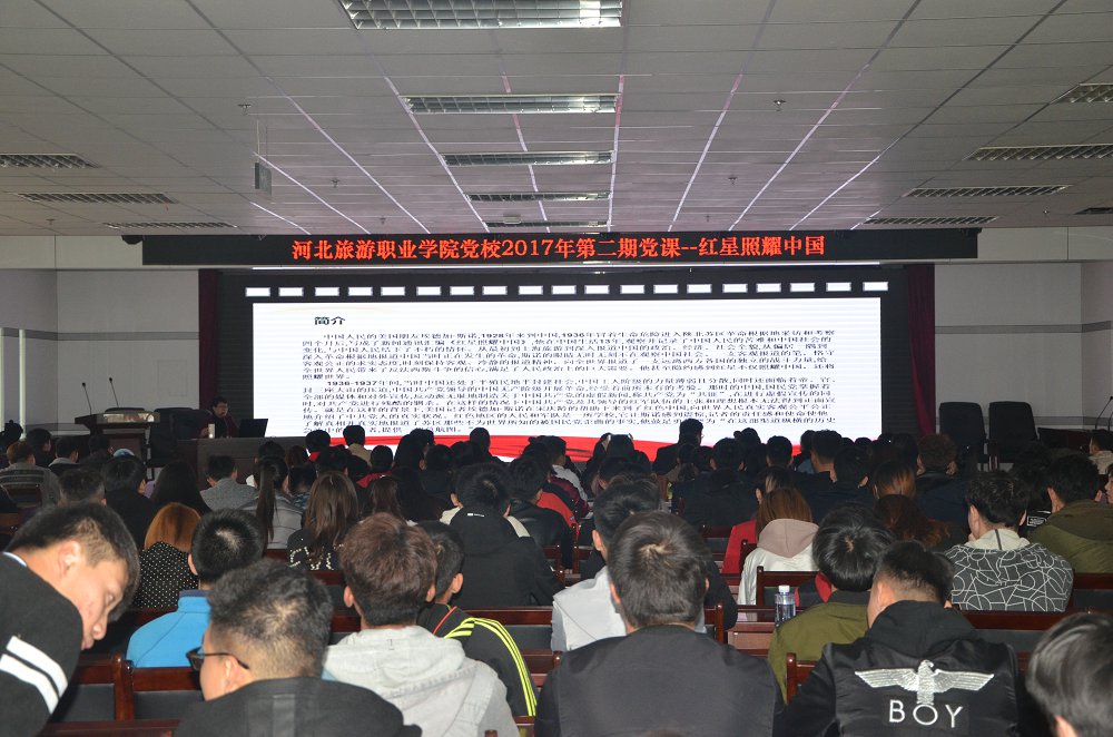 10月17日下午,河北旅游职业学院党校2017年第二期党课培训班正式开班,学院党委副书记范海燕同志为我院入党积极分子上了第一堂党课,党课的题目为《红星照耀中国》,来自全院12个系的200多名入党积极分子参加了党课学习。