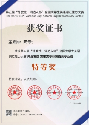 学生竞赛成绩斐然,彰显卓越人才培养成效。五年来,我校学子在各类高水平英语竞赛中屡创佳绩,捷报频传。在河北省职业院校技能大赛英语口语赛项、“外研社杯”职场英语挑战赛、全国大学生英语词汇能力大赛等权威赛事中,累计获得国家级一等奖、二等奖,省级金、银、铜奖等荣誉数十项。特别是在“理解当代中国”大学生外语能力大赛等具有时代高度的赛事中取得突破,充分体现了我校学生扎实的语言功底、出色的思辨能力与深厚的家国情怀。