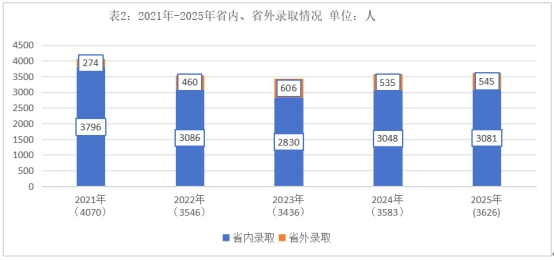 生源状况平稳,规模与结构双重保障。我校通过专业内涵建设与行业需求精准对接、多元培养渠道与不同群体入学需求适配,达成生源规模与结构的双重保障。生源数量保持稳定(见表1),充分体现社会对学校办学质量的高度认可。生源结构持续优化,布局更趋合理,省内生源占比稳定在约85%(见表2),省外生源覆盖全国23个省份(如辽宁、山西、河南、内蒙古等),区域结构进一步均衡,与学校服务区域经济、辐射全国行业需求的办学定位相契合。文科、理科、艺术类生源比例协调,与学校专业设置需求相匹配,为差异化人才培养提供精准支撑。普通高考招生、高职单招、中高职贯通等招生类型相互补充,满足不同群体入学需求,为学校分层分类人才培养体系的构建奠定了坚实的生源基础。