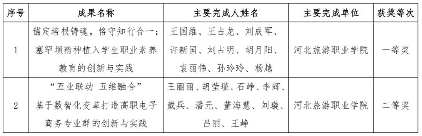 近日,河北省人民政府发布了《河北省人民政府关于2025年度河北省教学成果奖励的决定》。我校党委书记王国维主持的教学成果“锚定培根铸魂,恪守知行合一:塞罕坝精神植入学生职业素养教育的创新与实践”荣获一等奖;现代商务学院院长王丽丽主持的教学成果“‘五业联动 五维融合’基于数智化变革打造高职电子商务专业群的创新与实践”荣获二等奖。