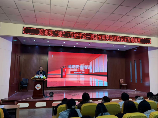 我校安全工作处(武装部)副处长(副部长)杨有亮应邀为师生做消防安全专题培训。他用详实的视频案例说明注意防范火灾的重要性。他表示:“火灾是一种突发性强、危害性大的灾害,我们每个人都应该对消防安全有足够的认识和防范。”他通过校园生活实例讲解了宿舍防火、用电等注意事项,提醒同学们在宿舍要遵守用电安全规定,不乱接电线、不使用劣质电器,并结合烹饪专业特点讲解了厨房起火的应急处理办法并详细介绍了各种消防设施的使用方法。