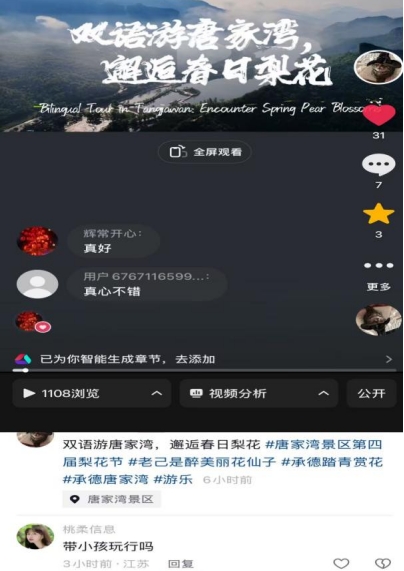 在课程育人环节,《旅游新媒体运营》课程将课堂搬进唐家湾景区第四届梨花节现场,全体学生以“数字文旅推荐官”身份完成短视频创作实训。学生每人独立完成一条15-60秒宣传短视频,并运用剪映AI功能进行创作。作品发布后,超过30%的学生作品播放量超3000次,3条作品突破1万次播放。多名学生主动采用中英双语字幕或配音面向入境游客推介梨花节,展现了扎实的专业素养与创新能力。