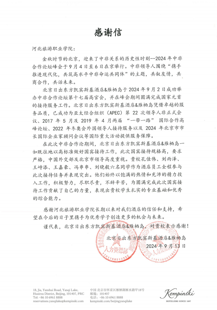 我校酒店管理学院孔佳伟、刘雨泽、王峙添、刘晓毅(民航2212班)、冯串串、王嘉豪(酒管225班)六名同学作为酒店员工,全程参与本次接待工作,他们以饱满的热情和充沛的精力投入到接待工作中,积极努力,认真负责,不辞辛苦,为圆满完成此次高规格国宾接待工作贡献了自己的力量,在非洲友好国家面前展现出我校学子扎实的专业基础和优秀的综合能力。学生们的优秀表现得到北京日出东方凯宾斯基酒店的高度认可,我校因此收到感谢信。
