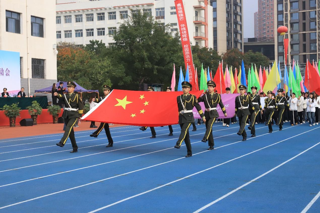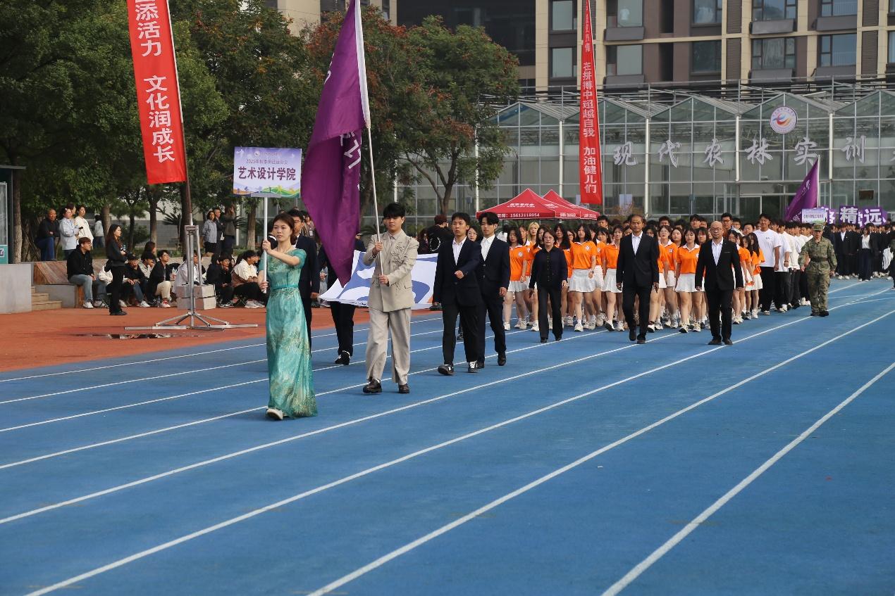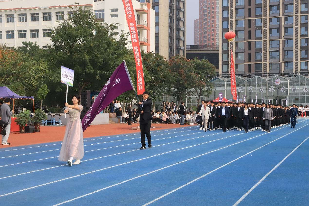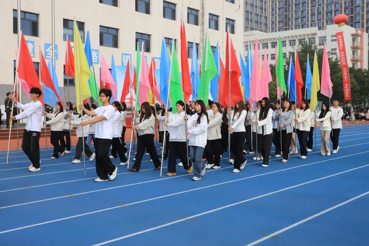 开幕式当天,温暖的阳光洒满运动场,轻轻落在每一位参与者的脸庞,将他们眼中的期待与心底的兴奋映照得格外明亮。伴随着激昂的旋律,国旗护卫队队员身着挺拔制服,迈着沉稳而铿锵的步伐,护送着鲜艳的五星红旗缓缓走向会场中央。这一刻,全场师生自发肃立,目光紧紧追随国旗,用最庄重的姿态致以崇高敬意,爱国情怀在运动场中悄然升腾。紧随其后的是各学院方阵,创意满满的学院特色以及响彻赛场的嘹亮口号,瞬间点燃全场热情。同学们身着色彩绚丽的服装,用昂扬的姿态、饱满的热情,将运动场上的每一个角落都染上了青春的色彩与活力。