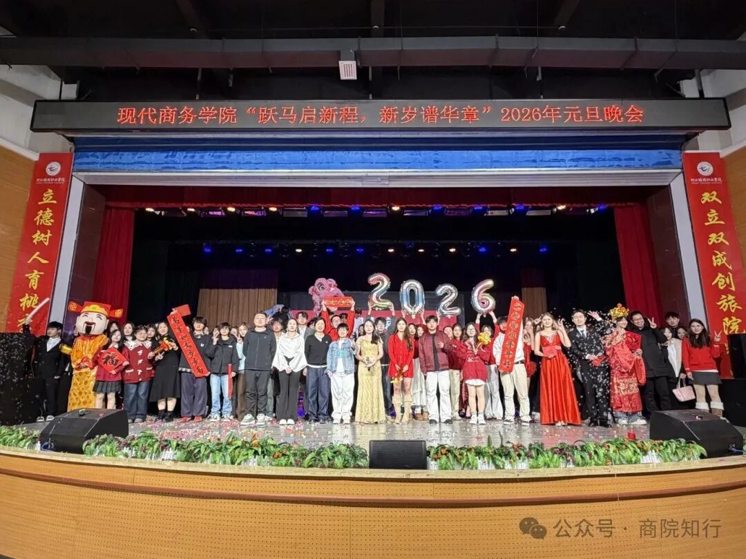 “策马扬鞭,福满校园”。在2026年马年即将到来之际,为营造良好的校园文化氛围,丰富校园文化生活,“商”马当先,不负韶华——现代商务学院2026年元旦联欢会于12月30日精彩上演。全体师生欢聚一堂,共赴辞旧迎新的盛会。