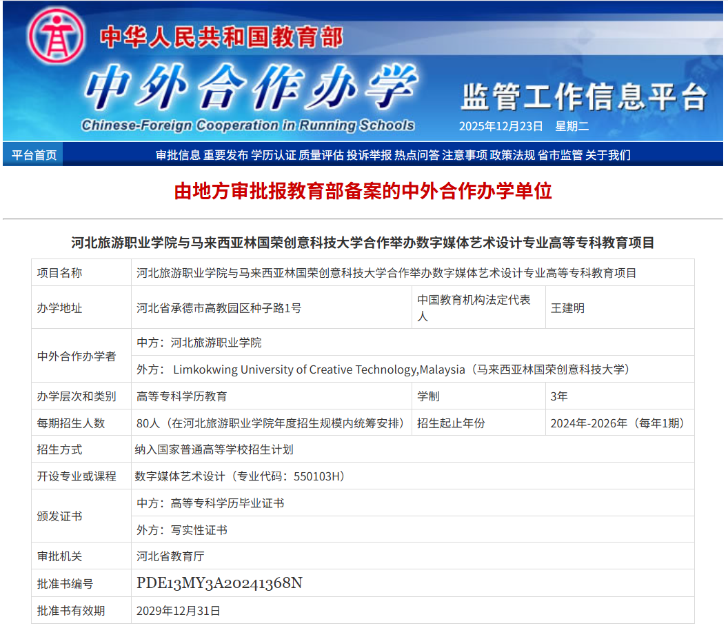 学校与马来西亚林国荣创意科技大学合作举办的数字媒体艺术设计专业高等专科教育项目顺利通过教育部备案