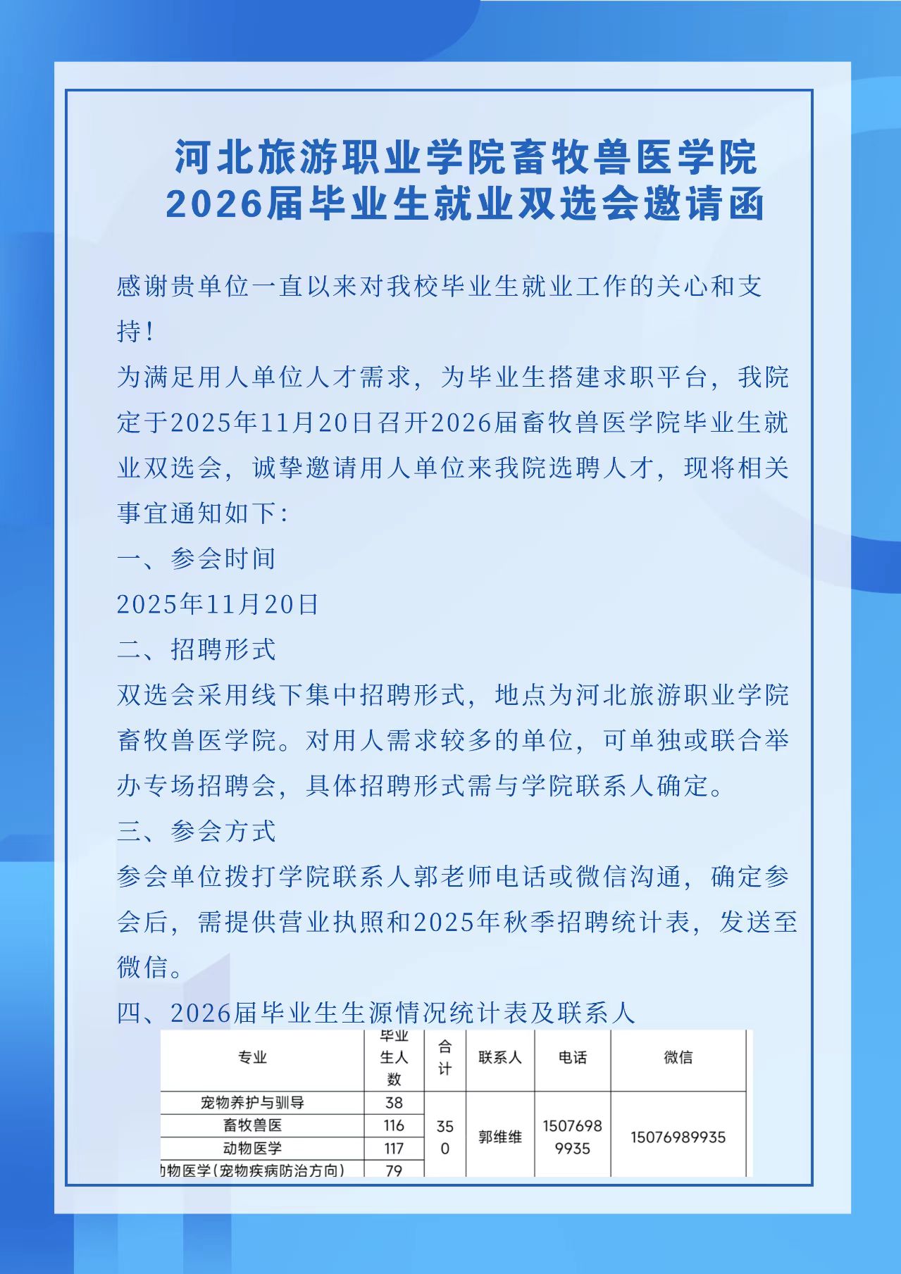 河北旅游职业学院畜牧兽医学院2026届毕业生就业双选会邀请函