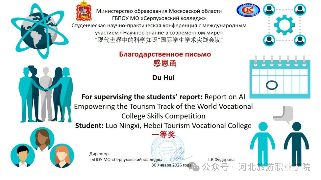 其中,我校文化旅游学院学生罗柠曦围绕人工智能赋能职业教育与技能竞赛,完成研究报告《AI赋能世界职业院校技能大赛》,经国际评审委员会评审,荣获一等奖。该研究结合旅游专业特点,探讨了人工智能在世界职业院校技能大赛旅游赛道中的应用实践与发展路径。该项目由教师杜辉指导,指导教师同时获得会议主办方颁发的电子感谢信。