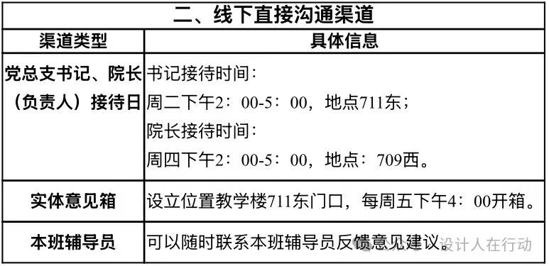 为进一步畅通学院与学生之间的沟通机制,广泛听取学生意见建议,及时回应和解决学生在学习、生活中遇到的各类问题,充分吸纳学生参与学校及学院建设发展的智慧与力量,共同营造和谐、优质的育人环境,现就艺术设计学院全面规范建立学生诉求反馈渠道相关事宜通知如下: