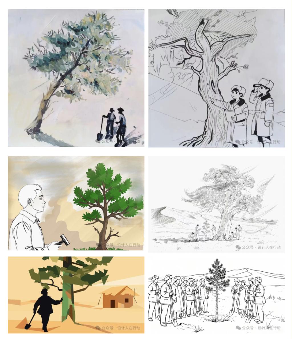 画作聚焦那棵著名的“功勋松”。它不仅是生命奇迹,更是信仰图腾——见证了一代青年将青春播种于荒原的初心。