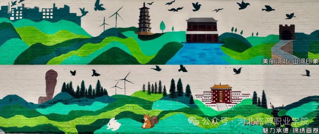以笔为媒,匠心绘就山河印象。活动启动前,学院组建核心设计团队,多次深入社区实地测量,结合墙体结构与社区环境反复打磨方案。从“美丽河北·山河印象”的壮美开篇,到“魅力承德·锦绣画卷”的地域呈现;从“生态家园·万物共生”的和谐图景,到“绿意盎然·绿化养护”的日常守护;从“守护蔚蓝·垃圾分类”的文明倡导,到“低碳出行·绿色生活”的理念传递,再到“节水惜水·河湖润城”的生态关怀、“志愿同行·守护地球”的使命担当——八个篇章层层递进,将生态文明的宏大主题,化为墙头可见、触手可及的生活美学,让原本斑驳的老旧墙体成为会“说话”的生态教科书。