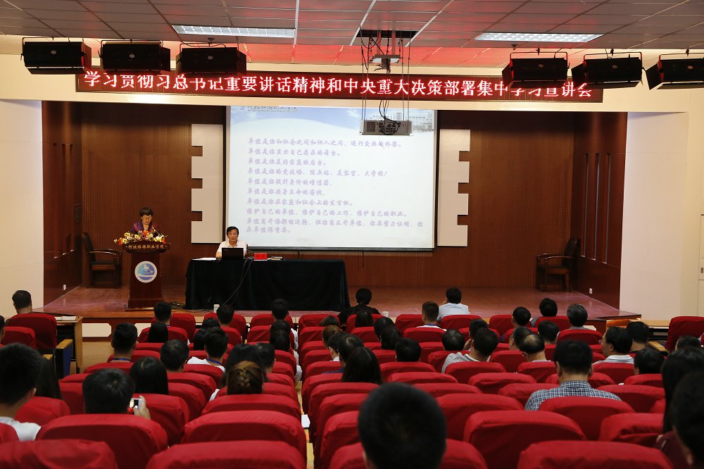 学院党委副书记范海燕要求全院师生要认真学习领会杨宏书记宣讲精神,特别是各部门领导干部要做好本部门的学习传达工作,以上率下,做出示范,把学习习近平总书记系列重要讲话精神作为基本功、必修课,真正做到学而信、学而思、学而行,真正做到思想认同、政治看齐、行动紧跟,以优异成绩迎接党的十九大胜利召开。(党政办供稿)