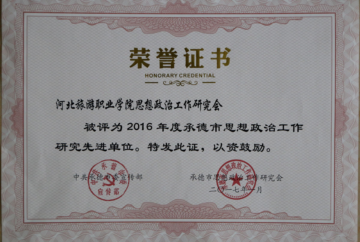 日前,学院政研会被承德市委宣传部和承德市思想政治工作研究会评为2016年度承德市思想政治工作研究先进单位。