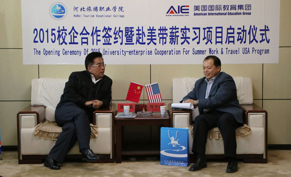 陈宇峰总裁介绍了美国国际教育集团的基本情况,双方就未来的校企合作、赴美带薪实习项目、专业实习项目、高层互访、教师海外培训、国际学生来华留学、创建国内外实习基地等项目展开了深入的交流与探讨,并针对旅游专业人才的培养、共同创建人才培养基地与就业实习基地达成了诸多共识。