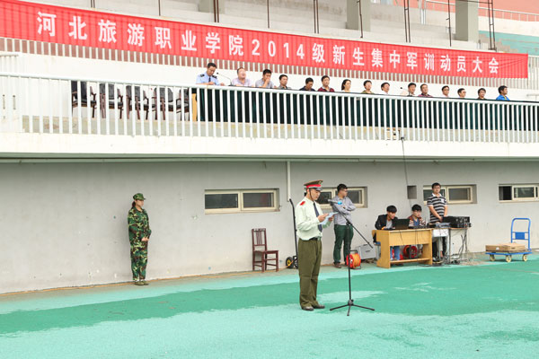 9月1日上午,河北旅游职业学院2014级新生集中军训动员大会在北校区运动场隆重举行。学院副院长刘占明、学生处处长、保卫处处长、团委副书记及各系书记出席了大会。大会由学院保卫处处长孙立民主持。