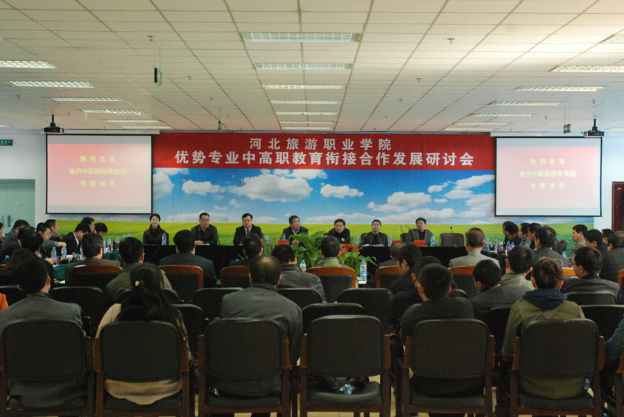 学院院长汤云航、承德市教育局副局长刘伟分别在会上致辞。学院副院长马显才介绍了学院中高职衔接合作发展思路。与会者就我省中高职教育发展现状、特点、前景以及中高职教育衔接的必要性、可行性等方面进行了充分讨论,对我院以优势专业为纽带开展中高职教育衔接工作,共谋发展的举措给予了充分肯定。河北旅游职业学院作为河北省唯一以旅游命名、以培养旅游类、现代农业类、现代管理类和信息机电类高技能专门人才为主的综合性高职院校,一直在不断探索中高职合作之路,坚持“资源共享、优势互补、协同发展、合作双赢”的原则,积极拓展中高职教育可持续发展空间,并率先与承德市各中职学校建立起深度合作的关系。此次与河北省各中职学校在招生考试、专业建设、课程开发、实习实训、师资培养、干部锻炼、就业推荐等领域开展深度合作,将进一步促进我省中高职教育的协调发展。