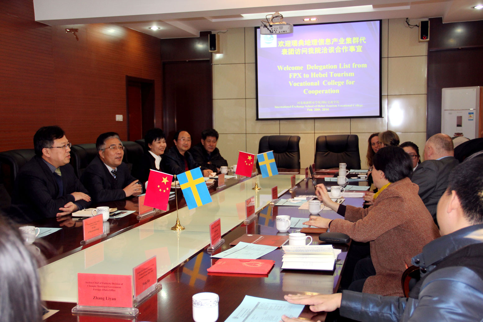 2月20日上午,瑞典地理信息产业集群总裁约翰•邦一行五人在承德市政府外事办主任闫洋等领导陪同下莅临我院参观访问,洽谈共同开发农业教育与旅游项目合作事宜。学院院长汤云航,副院长国际交流学院院长邸卫民、副院长刘占明接见了代表团成员并出席洽谈会。