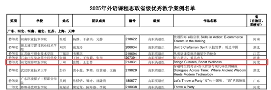 10月20日,2025年全国外语课程思政优秀教学案例征集与交流活动公布省级优秀教学案例名单,我校教师团队丁可、张悦、王志勇在本次赛事活动中荣获高职英语组特等奖。