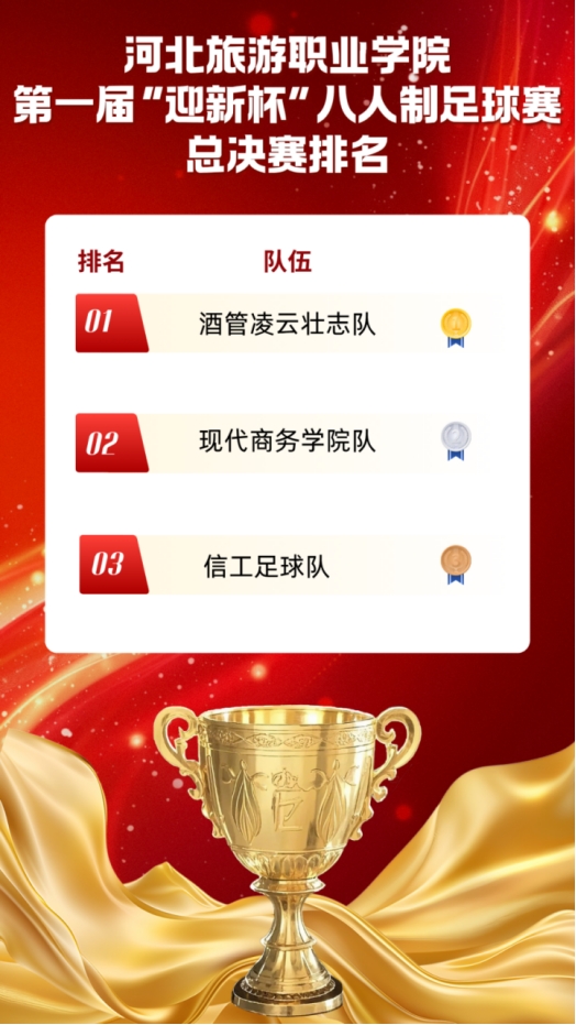 2025年10月至11月,学校成功举办第一届“迎新杯”八人制足球赛。比赛涵盖小组赛、半决赛及决赛等多个阶段,吸引了全校师生广泛关注。最终,酒店管理学院凌云壮志队凭借出色表现夺得冠军,为赛事画上圆满句号。