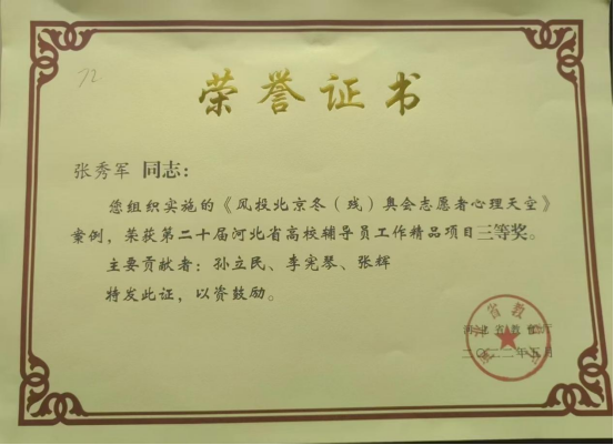 (心理保障团队撰写的心理案例《风投北京冬(残)奥会志愿者心理天空》荣获第二十届河北省高校辅导员工作精品项目三等奖)