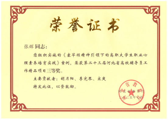 (心理服务中心申报的《塞罕坝精神引领下的高职大学生职业心理素养培育实践》案例荣获第二十三届河北省高校辅导员工作精品项目三等奖)