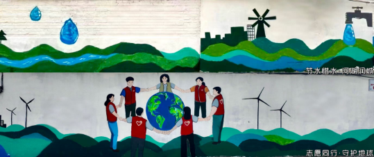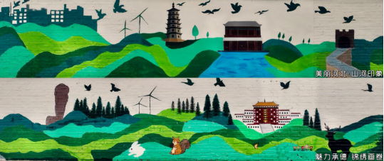 以笔为媒,匠心绘就山河印象。活动启动前,学院组建核心设计团队,多次深入社区实地测量,结合墙体结构与社区环境反复打磨方案。从“美丽河北·山河印象”的壮美开篇,到“魅力承德·锦绣画卷”的地域呈现;从“生态家园·万物共生”的和谐图景,到“绿意盎然·绿化养护”的日常守护;从“守护蔚蓝·垃圾分类”的文明倡导,到“低碳出行·绿色生活”的理念传递,再到“节水惜水·河湖润城”的生态关怀、“志愿同行·守护地球”的使命担当——八个篇章层层递进,将生态文明的宏大主题,化为墙头可见、触手可及的生活美学,让原本斑驳的老旧墙体成为会“说话”的生态教科书。