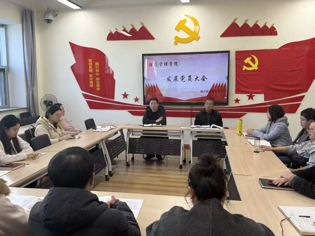 2025年12月2日,酒店管理学院党员发展大会在3号教学楼二楼党员活动室顺利举行。党总支书记沈博、副书记侯德成及学生党支部全体党员参会,会议流程严格遵循《中国共产党发展党员工作细则》规范开展。