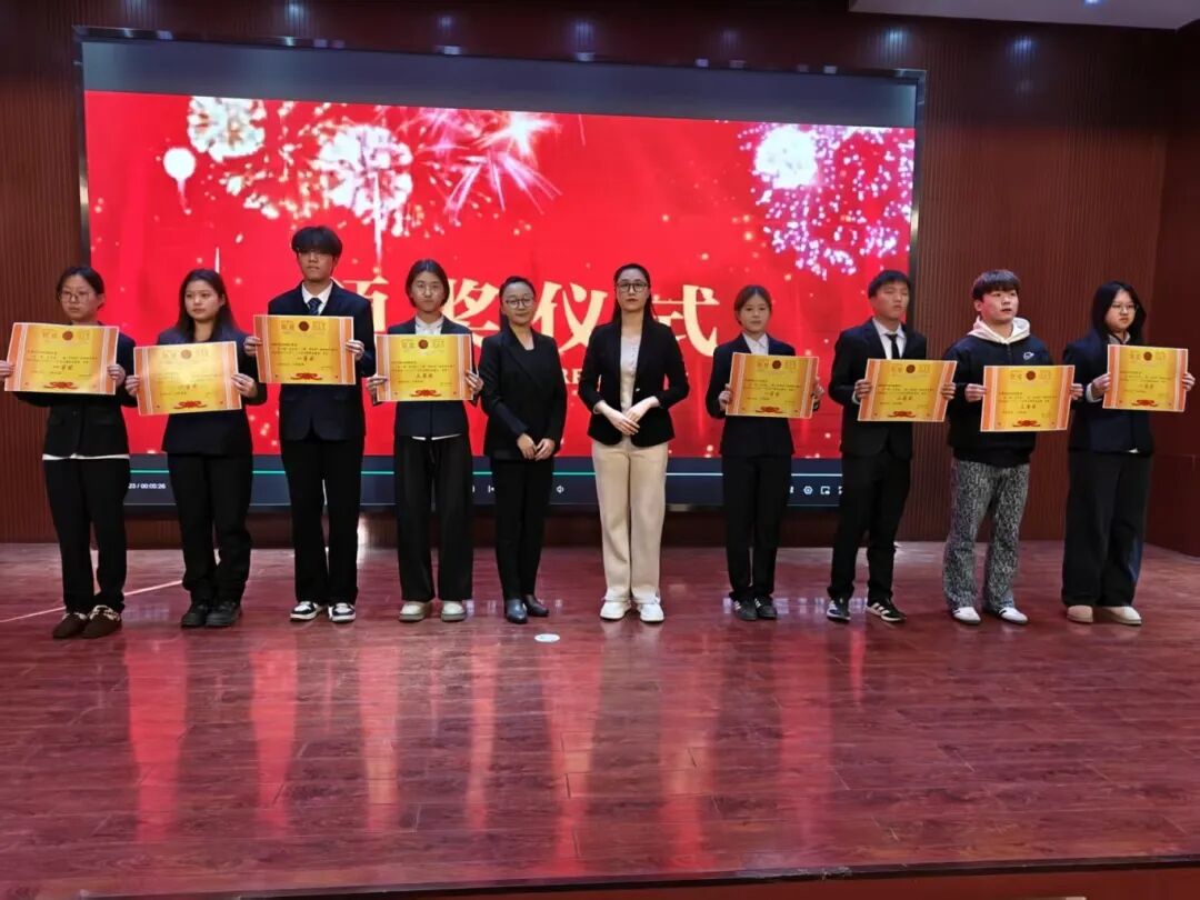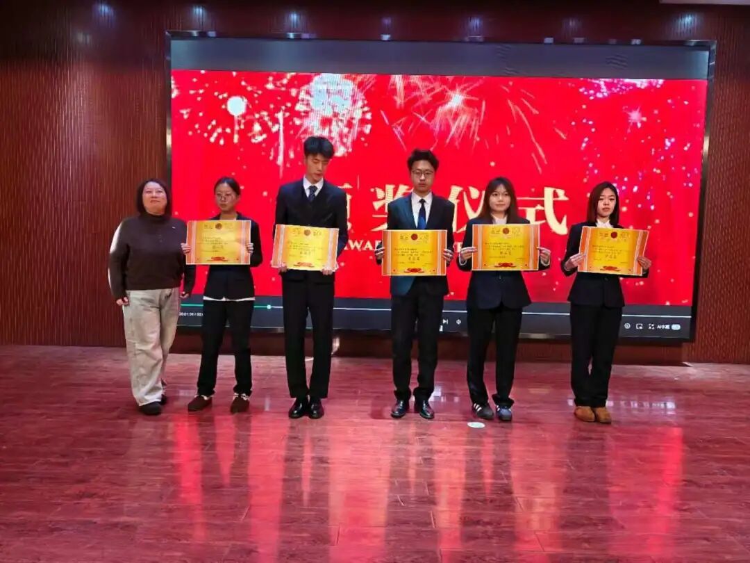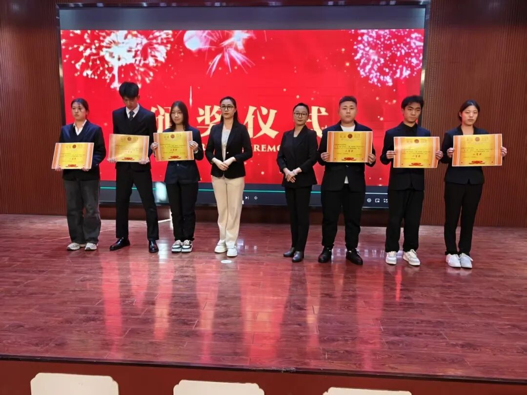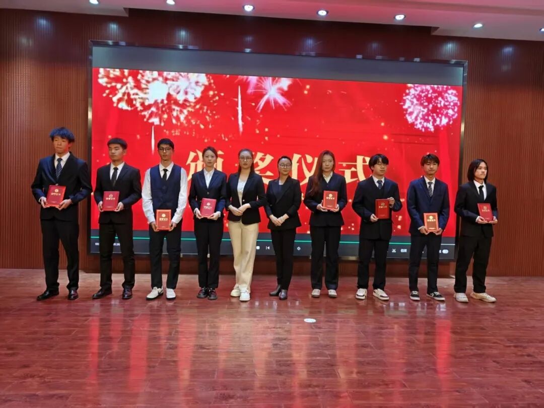 在热烈的掌声中,获奖集体与个人代表依次登台领奖:沈博和马磊为“2025年学院先进班集体”颁奖;李倩和卫婷婷为“‘寓’见安全,‘寝’筑防线”短视频大赛获奖班级、“有‘被’而来”内务整理比赛获奖班级颁奖;夏琳为“最美板报”获奖班级颁奖;雒鹤飞为“以班为家,共筑芳华”最美班集体颁奖;侯德成和刘伟为院级文明宿舍、“塞罕坝精神之家”文明宿舍颁奖;冯燕妮为院优秀学生干部及社团干部、男子足球队代表颁奖;李倩和卫婷婷为校运动会及校男子乒乓球比赛获奖代表颁奖。