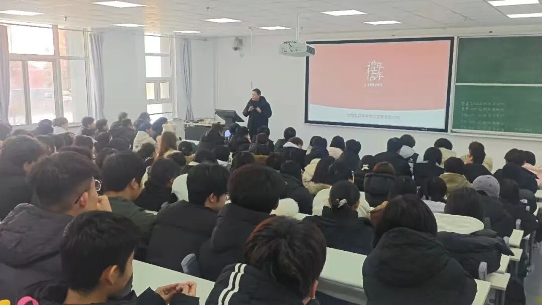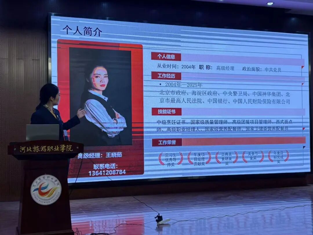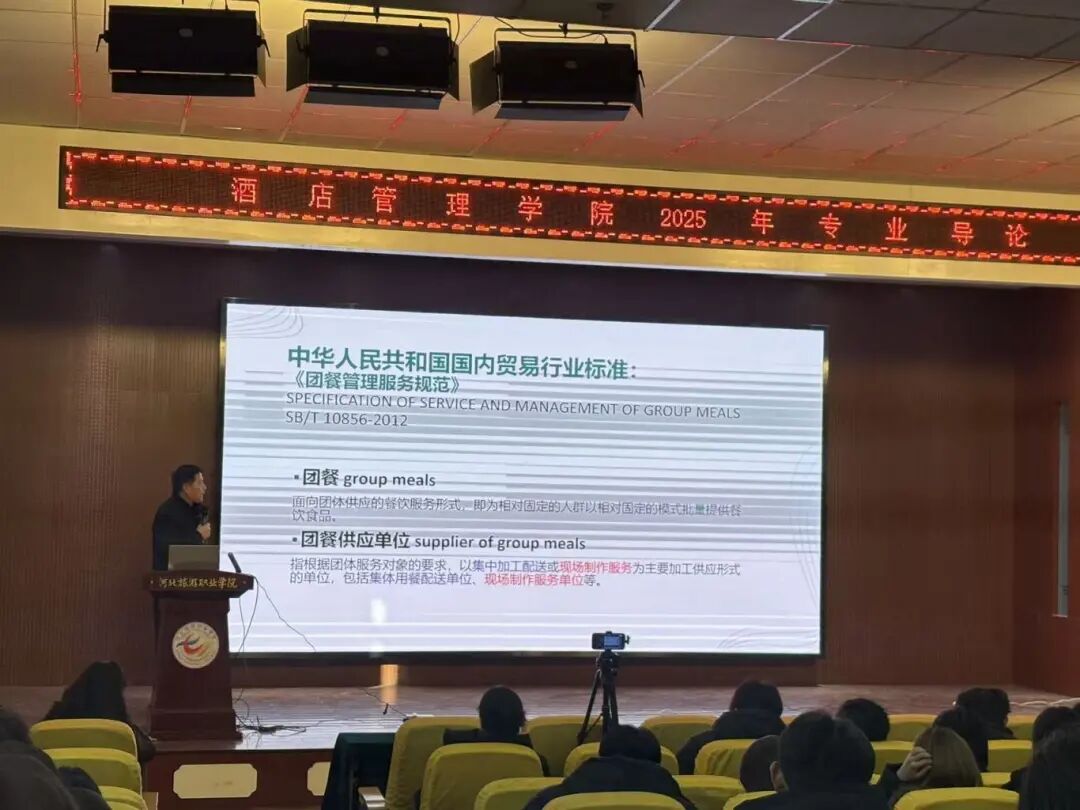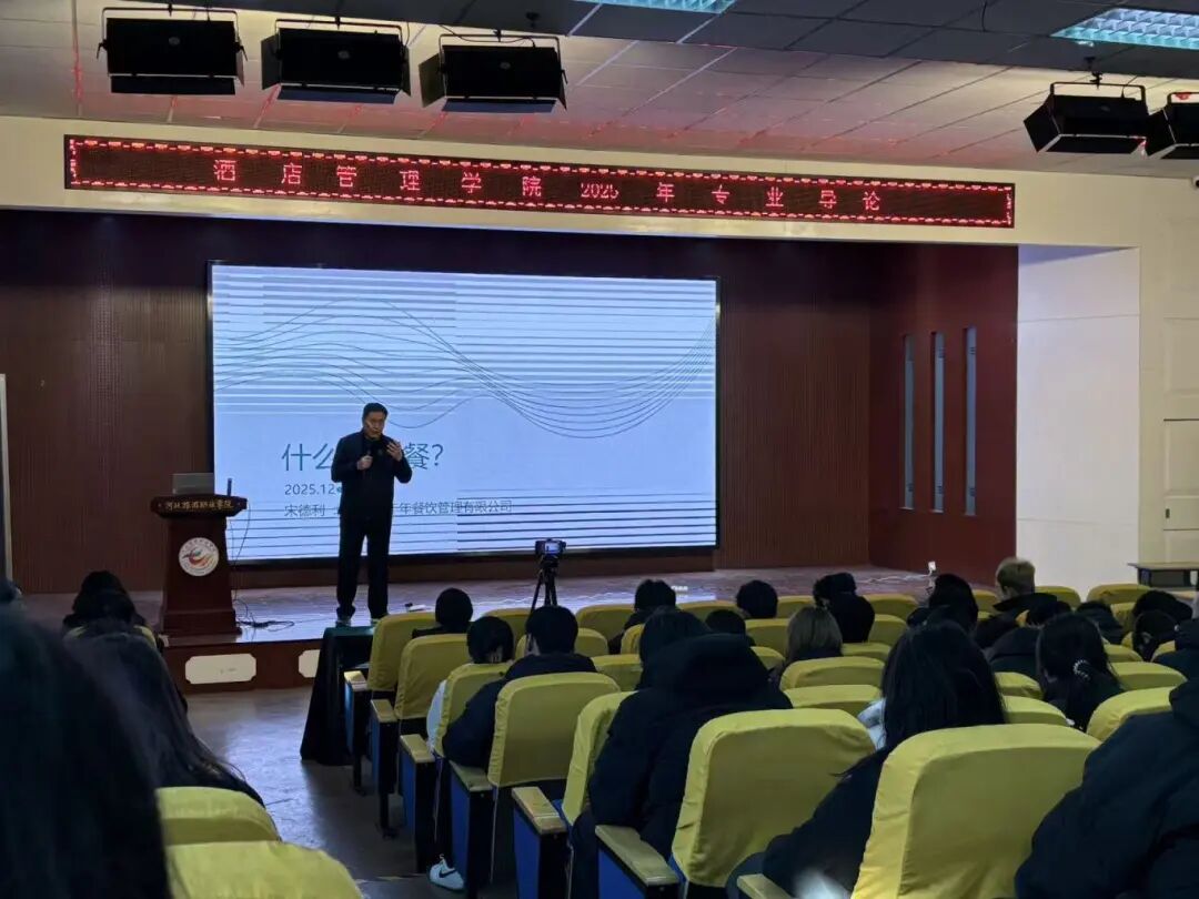 3号教学楼一楼报告厅酒店管理专业会场内,北京礼信年年餐饮有限公司总经理宋德利受邀主讲,以“餐饮行业与酒店管理的融合发展”为核心主题,从行业市场需求变化、品牌特色打造策略等角度展开深度论述,为同学们拓宽专业视野,明晰行业融合发展新路径。其后,礼信年年餐饮管理有限公司高级经理王晓茹结合个人发展经历,将同学们未来步入职场和社会做人做事的道理深入浅出倾囊相授,引发在场同学普遍共鸣。