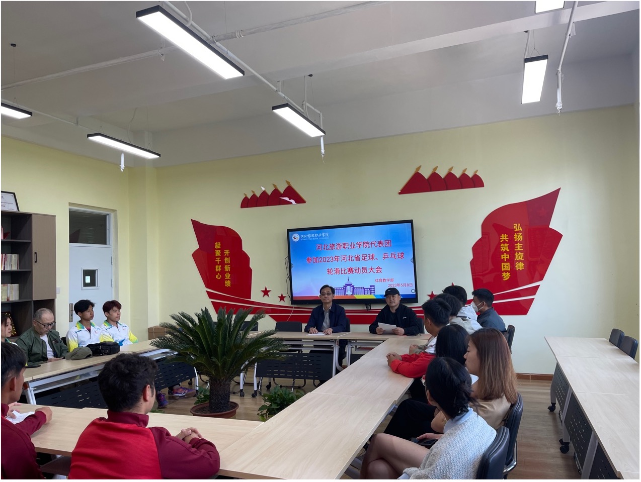 为深入贯彻落实党的二十大决策部署,加快建设体育强国,进一步加强高校体育工作,我校将参加河北省2023年高校各项大赛。乒乓球技能大赛将于5月11日-13日在邯郸举行、足球技能大赛将于5月14日—17日在邯郸举行、大运会轮滑比赛将于5月22日-26日在唐山举行。我校已于2023年3月中旬组建了乒乓球、足球、轮滑训练队,成立了以温守东副校长为团长的河北旅游职业学院代表团。为更好的鼓舞士气,凝聚力量,争创佳绩,2023年5月8日上午,体育教学部在行政楼312会议室召开了动员大会。出席本次会议的人员有学校副校长温守东同志、体育部韩玉军部长、全体教练员、运动员及体育部工作人员,会议由体育部韩玉军部长主持。