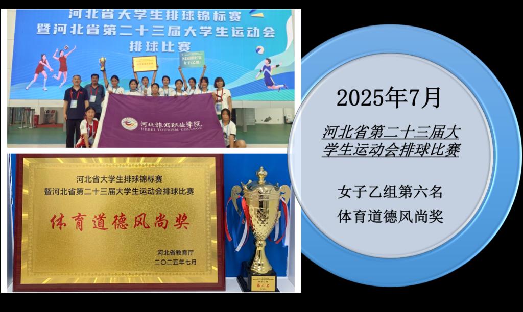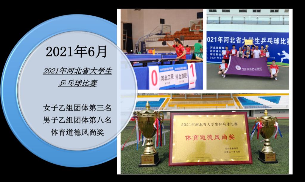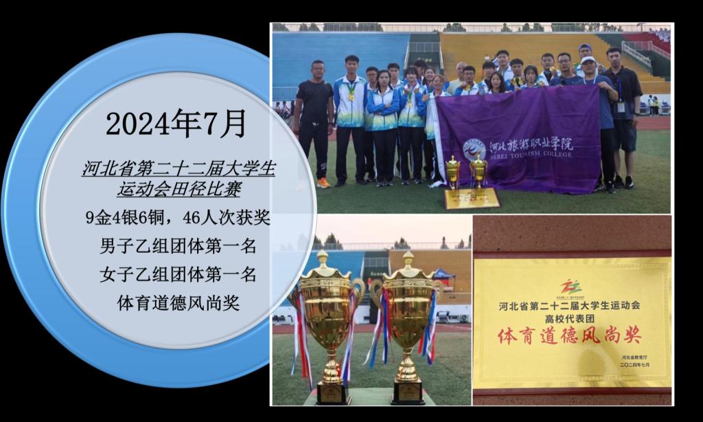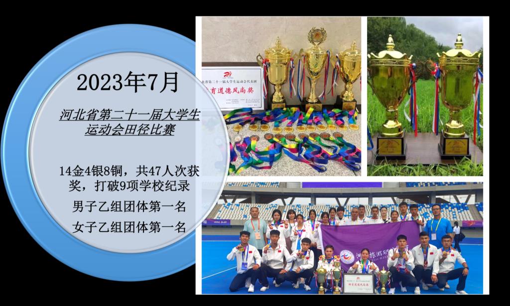 自河北省第十八届大学生运动会以来,我校已连续四届蝉联河北省大学生运动会乙组团体第一,成为唯一取得河北省大运会“四连冠”的学校,创造了旅院体育的辉煌历史,其中在河北省第二十一届大学生运动会田径比赛,我校共斩获14金、4银、8铜,累计47人次获奖,打破9项学校纪录,分别获得田径乙组男子、女子团体第一名并荣获体育道德风尚奖;河北省第二十二届大学生运动会田径比赛。我校共斩获9金、4银、6铜的好成绩,分别获得田径乙组男子团体第一名、女子团体第一名,并荣获体育道德风尚奖。这是继我校获得河北省大学生运动会“四连冠”后,又一次取得傲人成绩!
