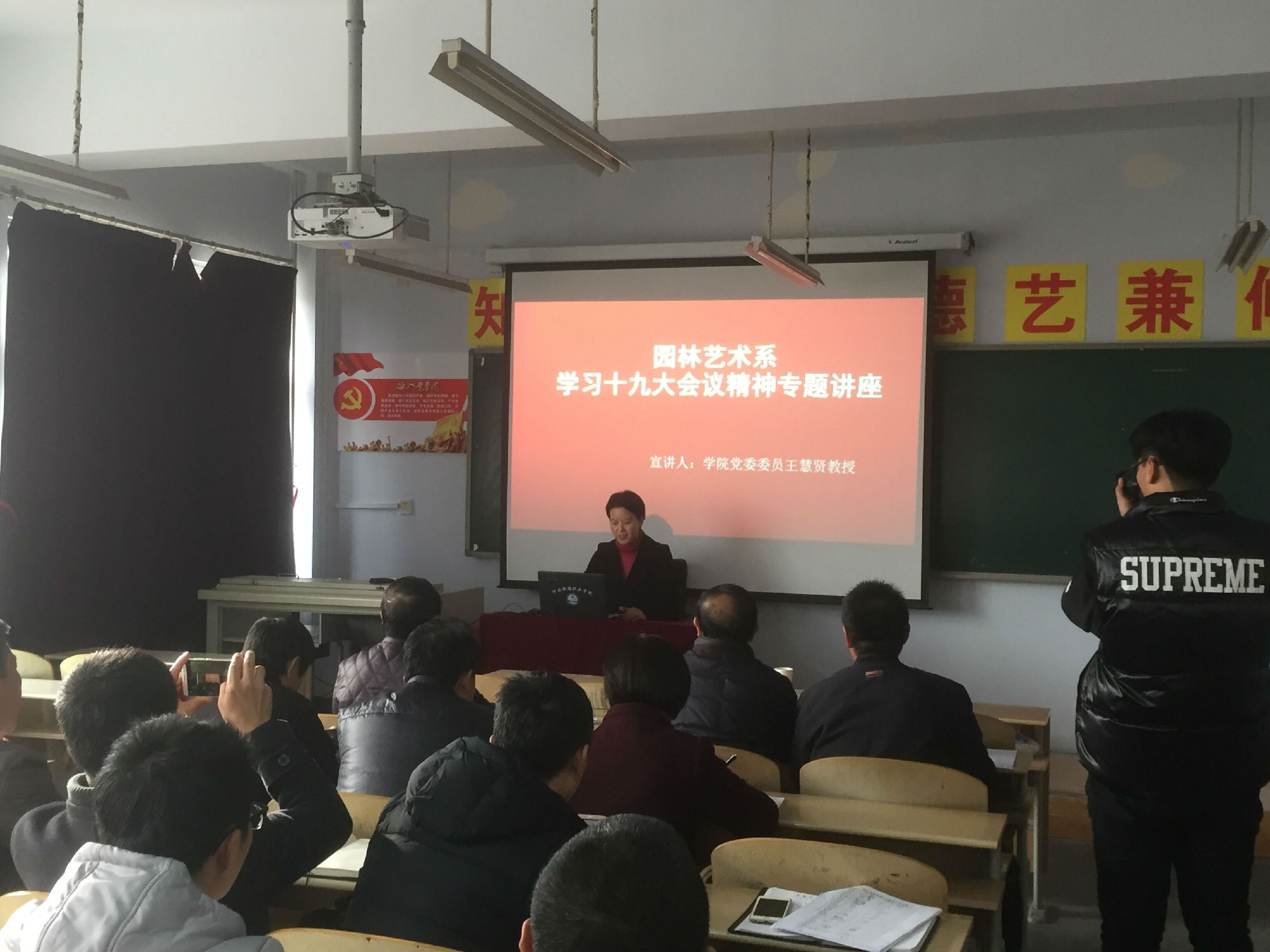 11月23日下午,学院党委委员王慧贤教授到园林艺术系宣讲党的十九大精神,园艺系全体教师、学生党员和入党积极分子参加了本次会议。