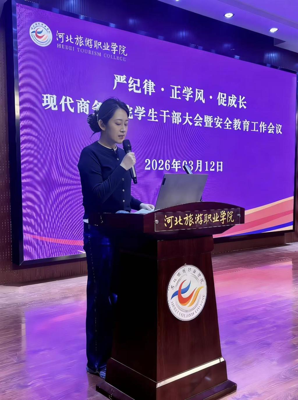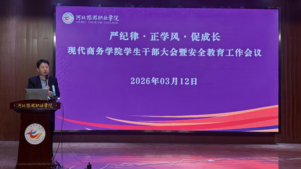 为进一步加强学生干部队伍建设,明确新学期工作任务,强化校园安全责任落实,3月12日现代商务学院在学术报告厅召开学生干部大会暨安全教育工作会议。学院党总支书记沈博、正科级辅导员鲁峰、全体专兼职辅导员及各班班委、团学组织学生干部参会,会议由刘雨绮老师主持。