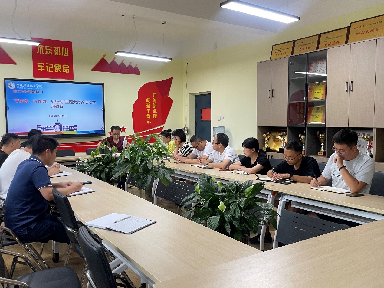 最后,刘玮院长传达了学校党委关于《“学思想、转作风、见行动”主题大讨论活动的实施方案》。组织全体人员集中学习了相关文件和习近平总书记视察河北、视察承德重要讲话精神。最后要求全体人员要结合实际工作和职责任务,深刻领悟“思想大解放、能力大提升、作风大转变、工作大落实”的核心要义、实践要求。