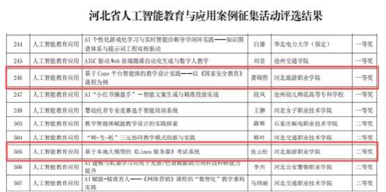 近日,河北省教育技术中心公布了2025年人工智能教育与应用案例征集活动评选结果。全省共1188件作品入围省级评选,最终评选出一等奖143项,二等奖296项,三等奖424项。我校信息与智能工程学院计算机网络技术专业教师龚硕然、张云松在本次活动中分别获得一等奖、二等奖。