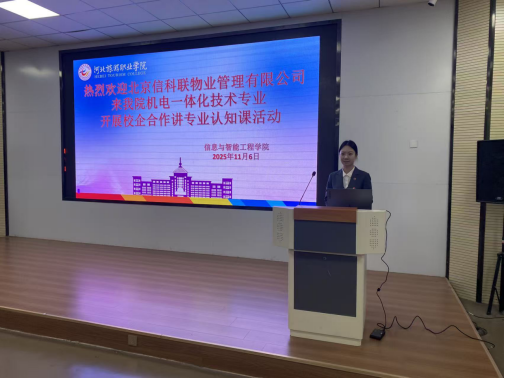 为践行“双立双成”育人理念,强化专业认知,夯实企业教学基础,信工学院于2025年11月6日在111报告厅举办了一场机电一体化技术专业认知讲座。此次活动由校企联合开展,特别邀请北京信科联物业管理有限公司招聘经理花旖旎担任主讲嘉宾,信工学院副院长宋艳颖、教研室主任邓号以及2024级、2025级机电一体化技术专业全体学生共同参加。