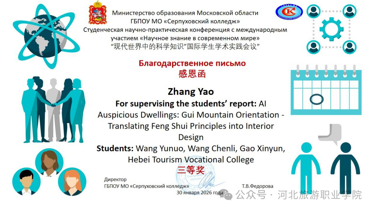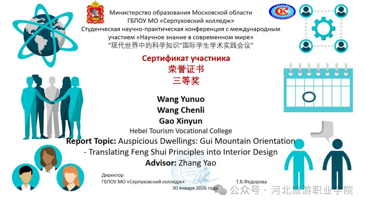据悉,本次会议聚焦信息通信技术与人工智能、数字经济、社会数字化进程以及科学与学生未来职业发展的关联等前沿议题。参会学生通过全英文或俄文线上展示的方式进行学术交流,获奖学生与指导教师均获得由谢尔普霍夫学院院长签署的电子获奖证书和感谢信。