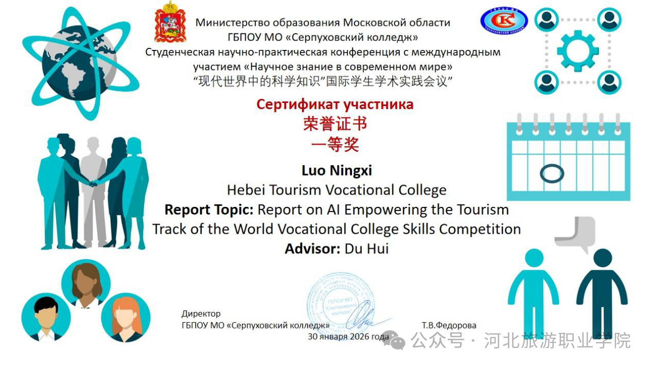 其中,我校文化旅游学院学生罗柠曦围绕人工智能赋能职业教育与技能竞赛,完成研究报告《AI赋能世界职业院校技能大赛》,经国际评审委员会评审,荣获一等奖。该研究结合旅游专业特点,探讨了人工智能在世界职业院校技能大赛旅游赛道中的应用实践与发展路径。该项目由教师杜辉指导,指导教师同时获得会议主办方颁发的电子感谢信。