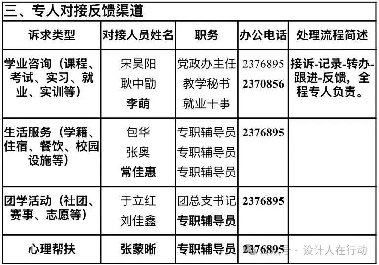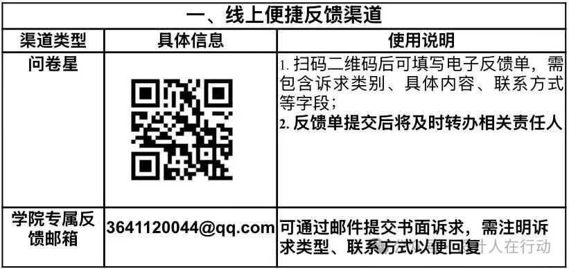 学院已结合实际,建立并完善学生诉求反馈渠道,明确反馈方式、处理流程与责任人,确保学生意见“有处说、有人管、有回音”。具体反馈渠道如下:
