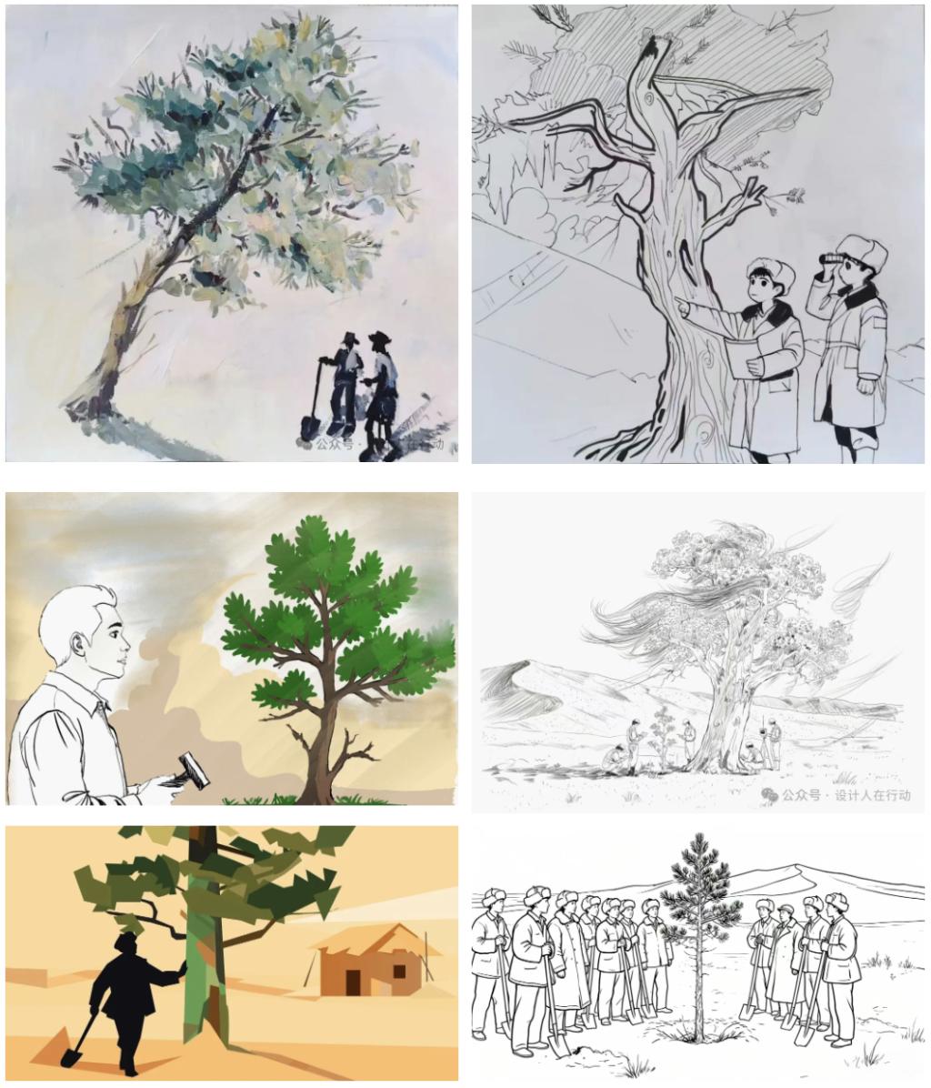 画作聚焦那棵著名的“功勋松”。它不仅是生命奇迹,更是信仰图腾——见证了一代青年将青春播种于荒原的初心。