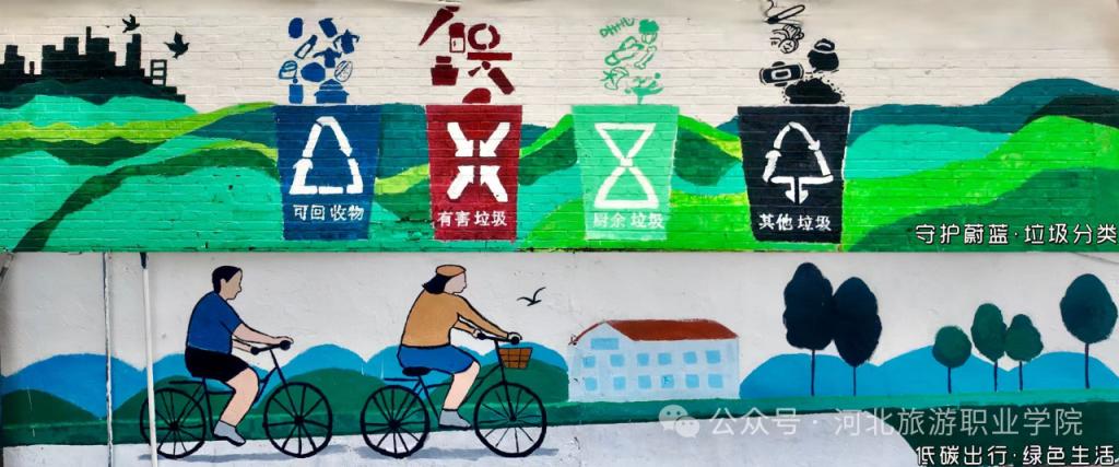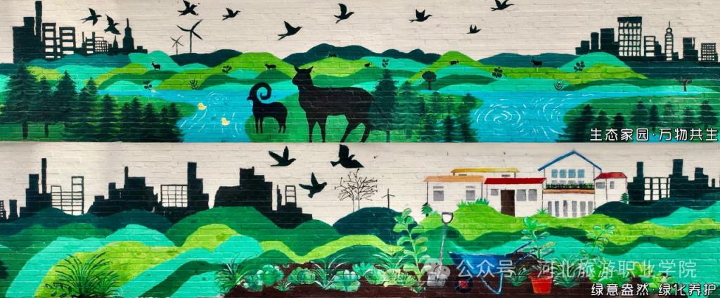 以笔为媒,匠心绘就山河印象。活动启动前,学院组建核心设计团队,多次深入社区实地测量,结合墙体结构与社区环境反复打磨方案。从“美丽河北·山河印象”的壮美开篇,到“魅力承德·锦绣画卷”的地域呈现;从“生态家园·万物共生”的和谐图景,到“绿意盎然·绿化养护”的日常守护;从“守护蔚蓝·垃圾分类”的文明倡导,到“低碳出行·绿色生活”的理念传递,再到“节水惜水·河湖润城”的生态关怀、“志愿同行·守护地球”的使命担当——八个篇章层层递进,将生态文明的宏大主题,化为墙头可见、触手可及的生活美学,让原本斑驳的老旧墙体成为会“说话”的生态教科书。